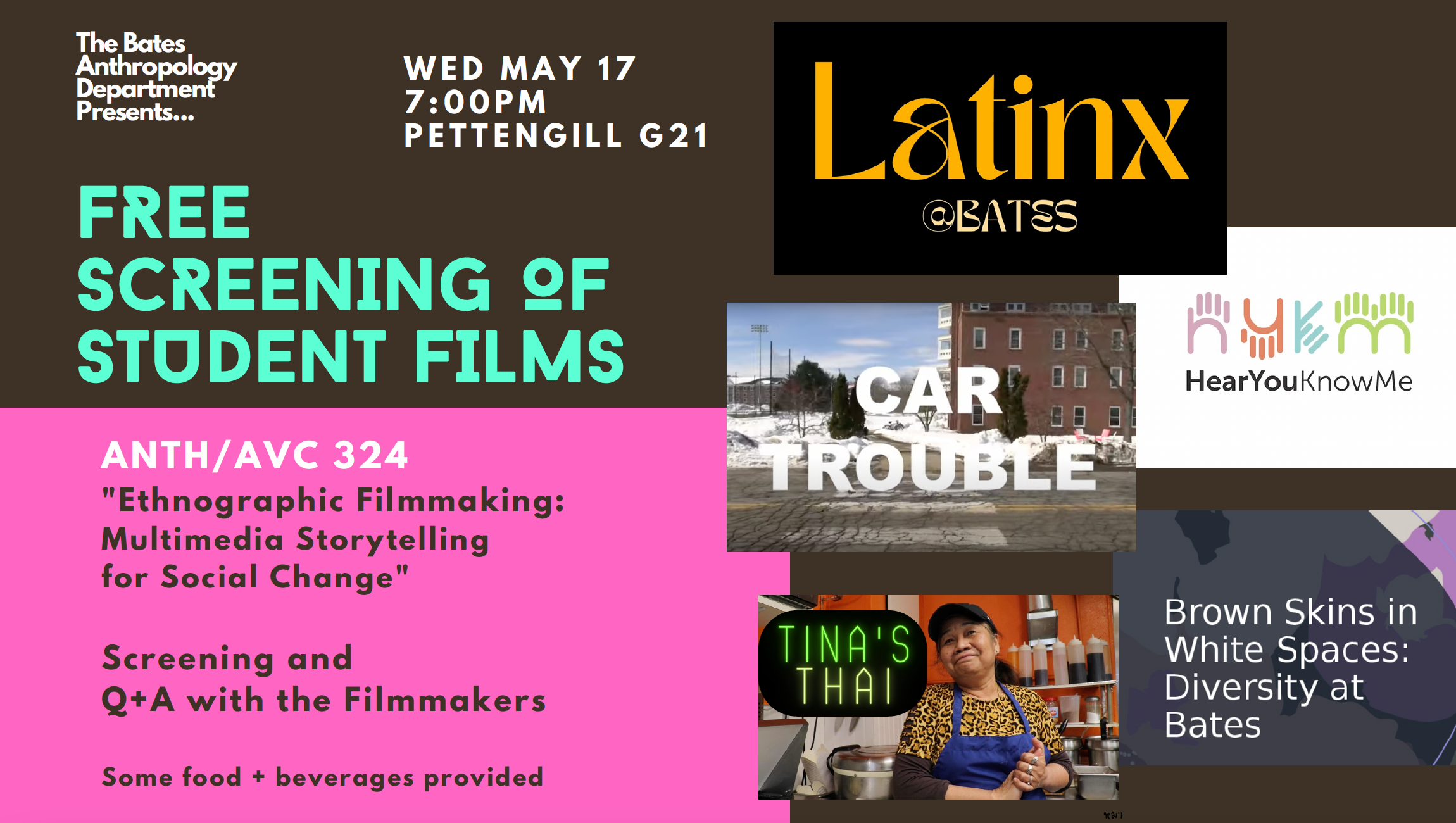 I also was so pleased to teach an incredible group of Bates students in my Spring Ethnographic Filmmaking course. The course is titled, Multimedia Storytelling for Social Change and students pushed their growing edges to create incredible media projects. Last week, we were so pleased to share them in a public screening with Bates community. One film featured a the proprietor of a local Thai restaurant in a gas station in Lewiston where Bates is located, Tina Thai Express. While we watched, we munched on delicious dishes from Tina’s. Another student’s film, juxtaposed the experiences of Black and African Bates students with research on institutional aims for diversity and inclusion. Students projects also included the social and class dynamics in Bates’s parking politics and car culture, the political and racial dynamics of hallucinogenic mushrooms on campus and the U.S., and emotional and personal portraits of Bates’s Latinx students’ experiences.